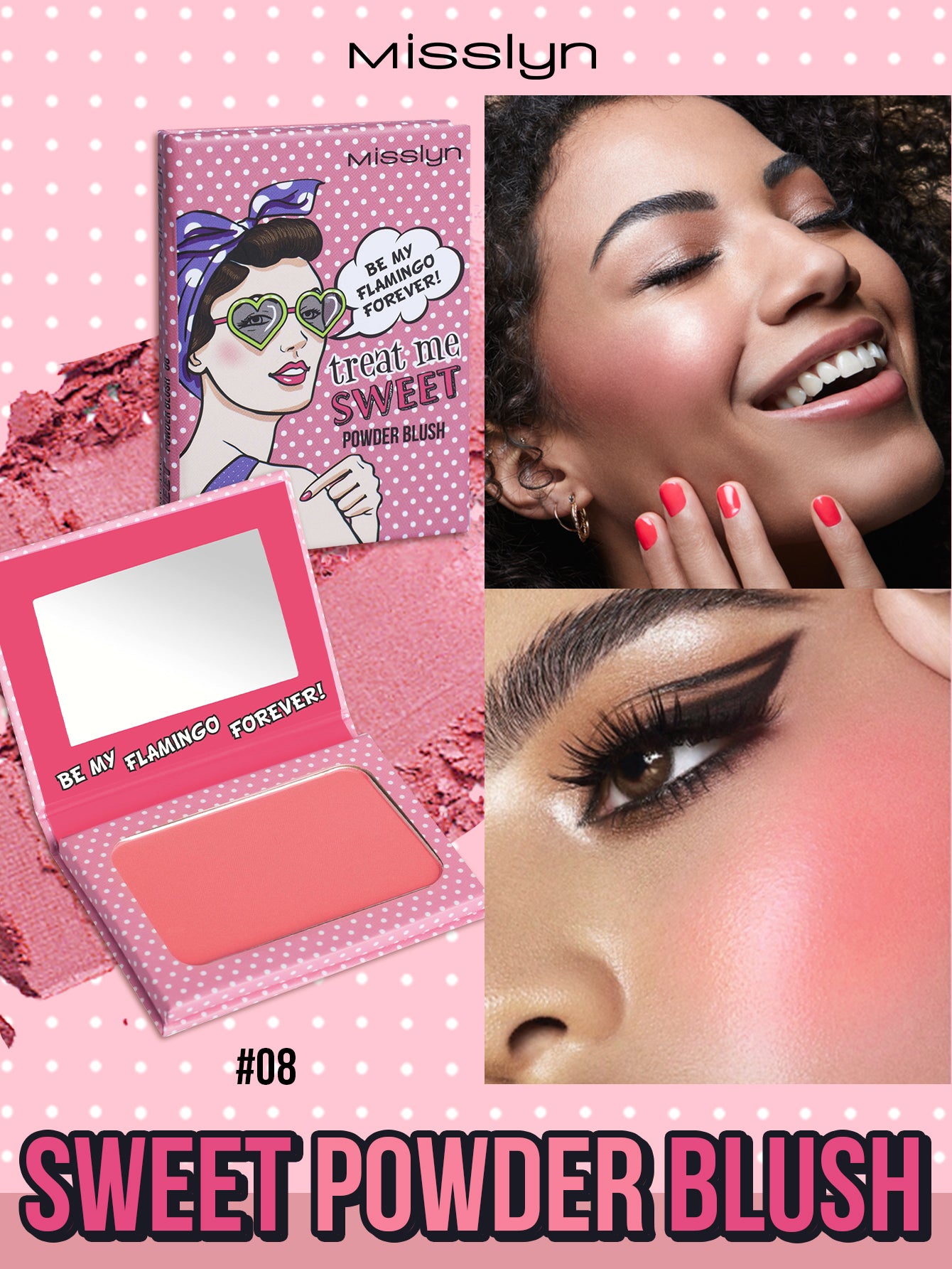 Il treat me SWEET POWDER BLUSH di Misslyn è blush ideale per del viso. Partendo dallo zigomo, posiziona i colori con un pennello o le dita sopra lo zigomo
